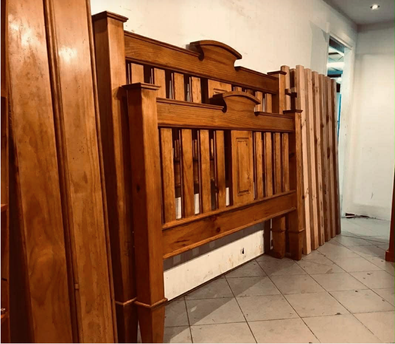 Good condition solid wood high back queen bed with thick wooden slats