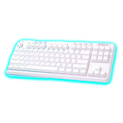 The Logitech G715 features a minimalist white design with pastel accents, aligning with the Aurora Collection's soft and inclusive aesthetic. Its rounded keycaps and subtle lighting effects create a visually appealing and cohesive look.